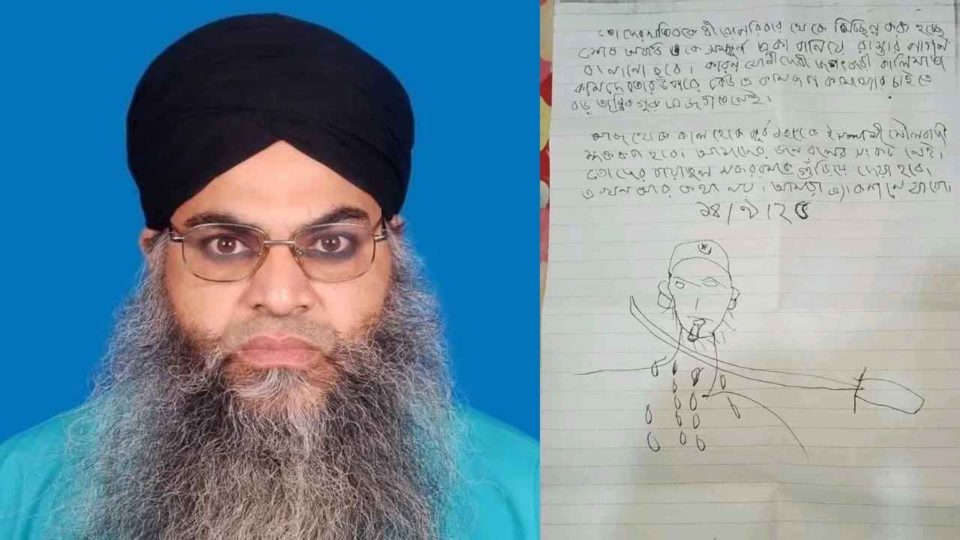 চিঠিতে পাঞ্জাবি-টুপি পরা এক হুজুরের প্রতিকৃতি এঁকে, তার গলায় ছুরি ধরে লেখা ছিল—