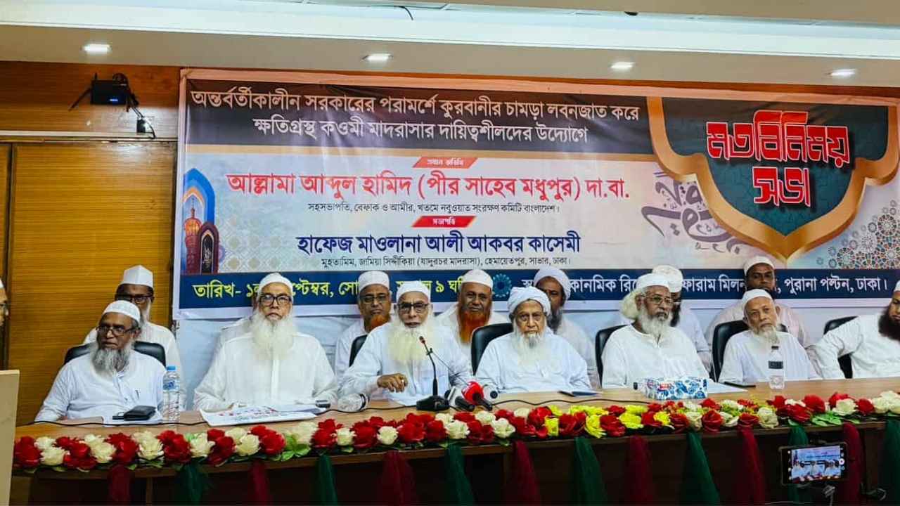 সদ্য সমাপ্ত কোরবানীর ঈদে অন্তর্বর্তীকালীন সরকারের বাণিজ্য উপদেষ্টার পরামর্শে কুরবানীর চামড়া লবনজাত করে ক্ষতিগ্রস্থ কওমি মাদরাসার দায়িত্বশীলদের উদ্যোগে মতবিনিময় সভা আজ ১লা সেপ্টেম্বর সোমবার সকাল দশটায় রাজধানীর ইকোনমিক রিপোর্টার্স ফোরাম মিলনায়তনে অনুষ্ঠিত হয়েছে।
