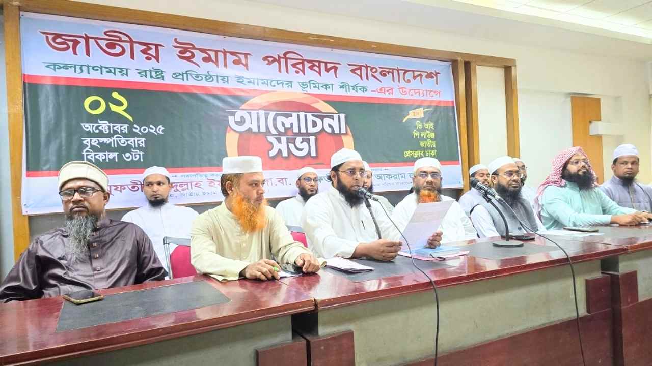 জাতীয় ইমাম পরিষদের উদ্যোগে “কল্যাণময় রাষ্ট্র প্রতিষ্ঠায় ইমামদের ভূমিকা” শীর্ষক আলোচনা সভা আজ জাতীয় প্রেসক্লাবে অনুষ্ঠিত হয়। পরিষদের সভাপতি মুফতি আব্দুল্লাহ ইয়াহিয়ার সভাপতিত্বে আয়োজিত এ সভায় দেশের উল্লেখযোগ্য মসজিদসমূহের ইমাম-খতিব ও শীর্ষ ওলামায়ে কেরাম অংশগ্রহণ করেন।