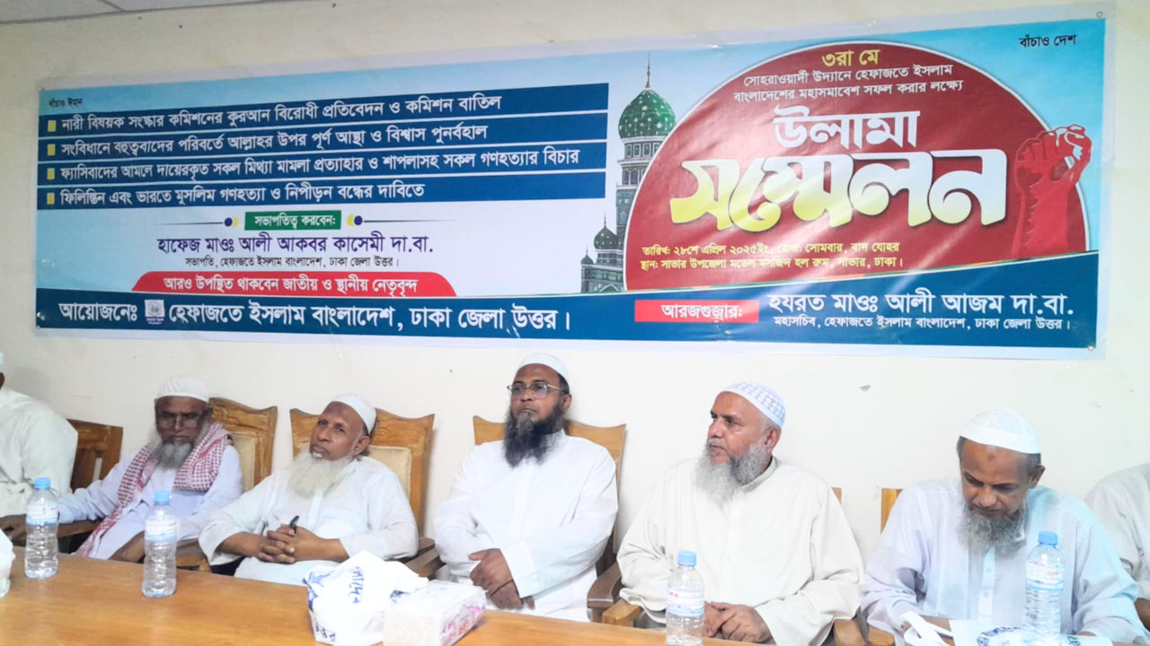 হেফাজতে ইসলাম বাংলাদেশ ঘোষিত আগামী ৩রা মে সোহরাওয়ার্দী উদ্যানের মহাসমাবেশ সফলে গতকাল ২৮ এপ্রিল সোমবার বাদ যোহর সাভার উপজেলা মডেল মসজিদ মিলনায়তনে উলামা সম্মেলন অনুষ্ঠিত হয়েছে। হেফাজত ঢাকা জেলা উত্তর আয়োজিত এই সম্মেলনে প্রধান অতিথি ছিলেন হেফাজতের কেন্দ্রীয় প্রচার সম্পাদক মুফতি কেফায়াতুল্লাহ আজহারী। বিশেষ অতিথি ছিলেন কেন্দ্রীয় সহ-সাংগঠনিক সম্পাদক মুফতি জাবের কাসেমী ও সহ-দফতর সম্পাদক মুফতি সিদ্দীকুল ইসলাম তোফায়েল।